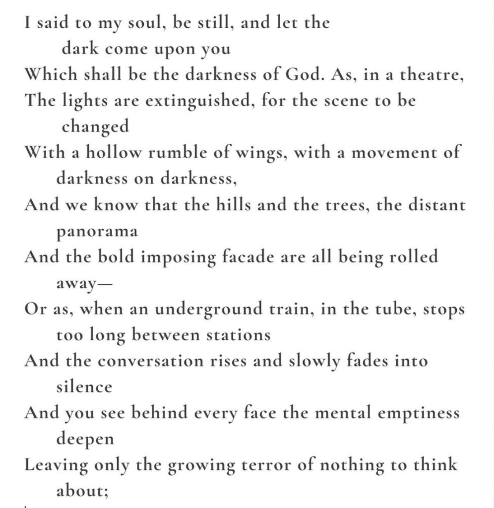 For most of these we’re taking our cue from a favourite Instagram site of mine – #realpoetsdaily Today, we’re blessed by this gem by T. S. Eliot, from “East Coker.”