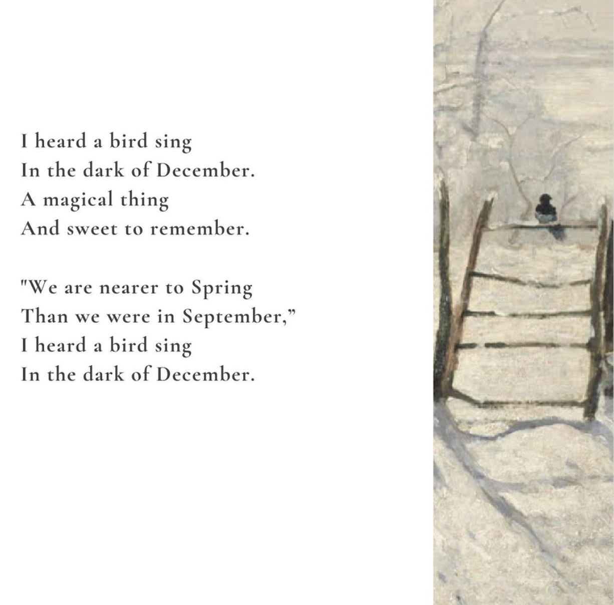 We intentionally missed a couple days. But, today I offer you this delightful poem, short but evocative, by Oliver Herford entitled, “I Heard a Bird Sing in the Dark of December.” Don’t forget to visit The Friendly Fogey where I find most of these gems.